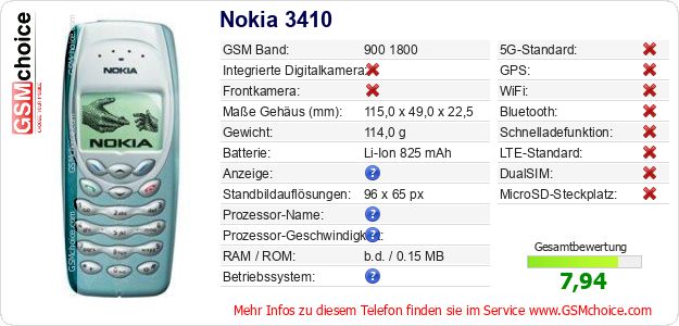 Hast du eigene Webseite? Willst du die Informationen über Standarddaten des Handys Nokia 3410 irgendwo veröffentlichen? Das ist sehr einfach. Du kannst das Bild herunterladen oder kopieren und auf der Webseite folgenden Code hinzufügen:Das Einfügen von diesem Code verursacht das Anzeigen von dem folgenden Bild: