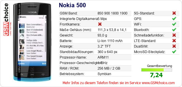 Hast du eigene Webseite? Willst du die Informationen über Standarddaten des Handys Nokia 500 irgendwo veröffentlichen? Das ist sehr einfach. Du kannst das Bild herunterladen oder kopieren und auf der Webseite folgenden Code hinzufügen:Das Einfügen von diesem Code verursacht das Anzeigen von dem folgenden Bild: