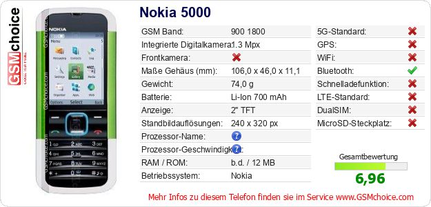 Hast du eigene Webseite? Willst du die Informationen über Standarddaten des Handys Nokia 5000 irgendwo veröffentlichen? Das ist sehr einfach. Du kannst das Bild herunterladen oder kopieren und auf der Webseite folgenden Code hinzufügen:Das Einfügen von diesem Code verursacht das Anzeigen von dem folgenden Bild: