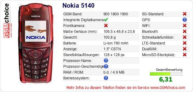 Hast du eigene Webseite? Willst du die Informationen über Standarddaten des Handys Nokia 5140 irgendwo veröffentlichen? Das ist sehr einfach. Du kannst das Bild herunterladen oder kopieren und auf der Webseite folgenden Code hinzufügen:Das Einfügen von diesem Code verursacht das Anzeigen von dem folgenden Bild: