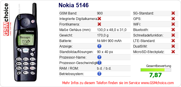 Hast du eigene Webseite? Willst du die Informationen über Standarddaten des Handys Nokia 5146 irgendwo veröffentlichen? Das ist sehr einfach. Du kannst das Bild herunterladen oder kopieren und auf der Webseite folgenden Code hinzufügen:Das Einfügen von diesem Code verursacht das Anzeigen von dem folgenden Bild: