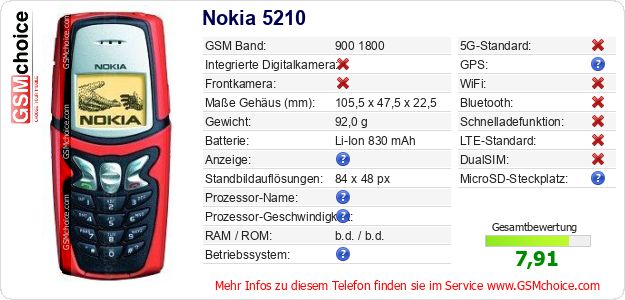Hast du eigene Webseite? Willst du die Informationen über Standarddaten des Handys Nokia 5210 irgendwo veröffentlichen? Das ist sehr einfach. Du kannst das Bild herunterladen oder kopieren und auf der Webseite folgenden Code hinzufügen:Das Einfügen von diesem Code verursacht das Anzeigen von dem folgenden Bild: