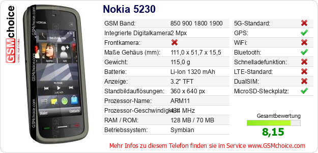 Hast du eigene Webseite? Willst du die Informationen über Standarddaten des Handys Nokia 5230 irgendwo veröffentlichen? Das ist sehr einfach. Du kannst das Bild herunterladen oder kopieren und auf der Webseite folgenden Code hinzufügen:Das Einfügen von diesem Code verursacht das Anzeigen von dem folgenden Bild: