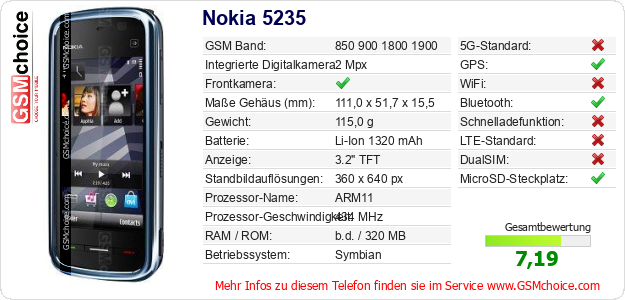 Hast du eigene Webseite? Willst du die Informationen über Standarddaten des Handys Nokia 5235 irgendwo veröffentlichen? Das ist sehr einfach. Du kannst das Bild herunterladen oder kopieren und auf der Webseite folgenden Code hinzufügen:Das Einfügen von diesem Code verursacht das Anzeigen von dem folgenden Bild: