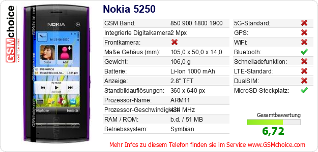 Hast du eigene Webseite? Willst du die Informationen über Standarddaten des Handys Nokia 5250 irgendwo veröffentlichen? Das ist sehr einfach. Du kannst das Bild herunterladen oder kopieren und auf der Webseite folgenden Code hinzufügen:Das Einfügen von diesem Code verursacht das Anzeigen von dem folgenden Bild: