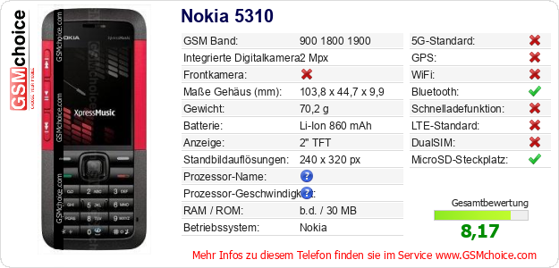 Hast du eigene Webseite? Willst du die Informationen über Standarddaten des Handys Nokia 5310 irgendwo veröffentlichen? Das ist sehr einfach. Du kannst das Bild herunterladen oder kopieren und auf der Webseite folgenden Code hinzufügen:Das Einfügen von diesem Code verursacht das Anzeigen von dem folgenden Bild: