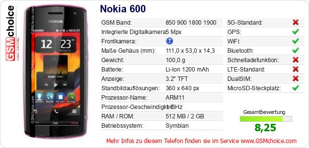 Hast du eigene Webseite? Willst du die Informationen über Standarddaten des Handys Nokia 600 irgendwo veröffentlichen? Das ist sehr einfach. Du kannst das Bild herunterladen oder kopieren und auf der Webseite folgenden Code hinzufügen:Das Einfügen von diesem Code verursacht das Anzeigen von dem folgenden Bild: