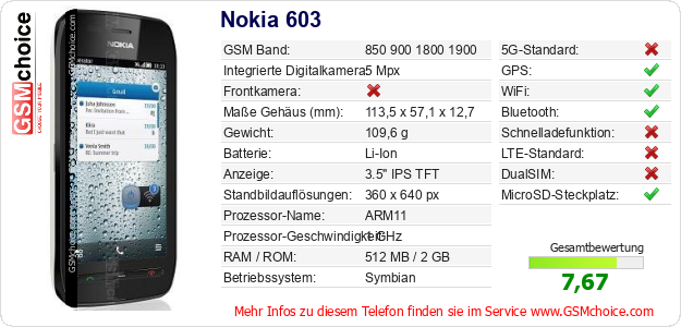 Hast du eigene Webseite? Willst du die Informationen über Standarddaten des Handys Nokia 603 irgendwo veröffentlichen? Das ist sehr einfach. Du kannst das Bild herunterladen oder kopieren und auf der Webseite folgenden Code hinzufügen:Das Einfügen von diesem Code verursacht das Anzeigen von dem folgenden Bild: