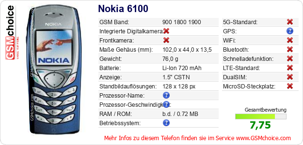 Hast du eigene Webseite? Willst du die Informationen über Standarddaten des Handys Nokia 6100 irgendwo veröffentlichen? Das ist sehr einfach. Du kannst das Bild herunterladen oder kopieren und auf der Webseite folgenden Code hinzufügen:Das Einfügen von diesem Code verursacht das Anzeigen von dem folgenden Bild:
