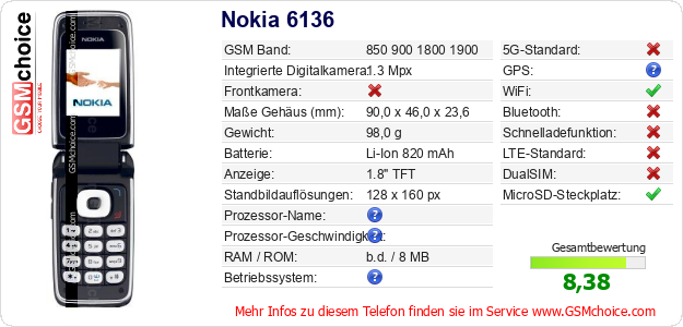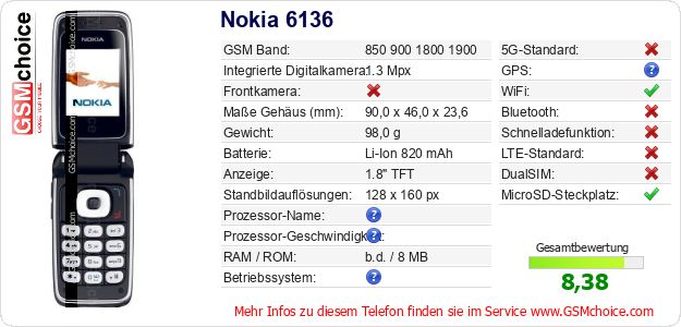 Hast du eigene Webseite? Willst du die Informationen über Standarddaten des Handys Nokia 6136 irgendwo veröffentlichen? Das ist sehr einfach. Du kannst das Bild herunterladen oder kopieren und auf der Webseite folgenden Code hinzufügen:Das Einfügen von diesem Code verursacht das Anzeigen von dem folgenden Bild: