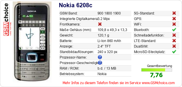 Hast du eigene Webseite? Willst du die Informationen über Standarddaten des Handys Nokia 6208c irgendwo veröffentlichen? Das ist sehr einfach. Du kannst das Bild herunterladen oder kopieren und auf der Webseite folgenden Code hinzufügen:Das Einfügen von diesem Code verursacht das Anzeigen von dem folgenden Bild: