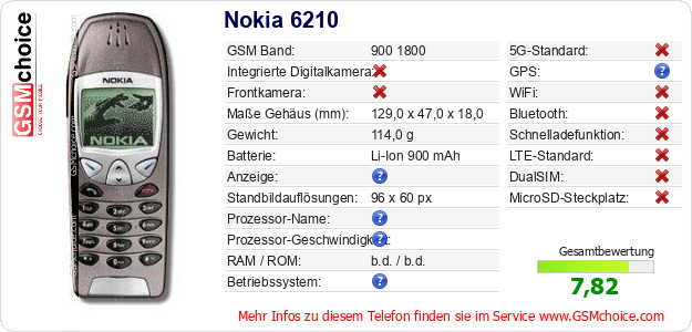 Hast du eigene Webseite? Willst du die Informationen über Standarddaten des Handys Nokia 6210 irgendwo veröffentlichen? Das ist sehr einfach. Du kannst das Bild herunterladen oder kopieren und auf der Webseite folgenden Code hinzufügen:Das Einfügen von diesem Code verursacht das Anzeigen von dem folgenden Bild: