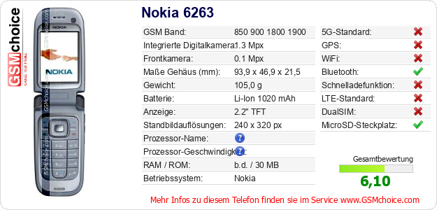 Hast du eigene Webseite? Willst du die Informationen über Standarddaten des Handys Nokia 6263 irgendwo veröffentlichen? Das ist sehr einfach. Du kannst das Bild herunterladen oder kopieren und auf der Webseite folgenden Code hinzufügen:Das Einfügen von diesem Code verursacht das Anzeigen von dem folgenden Bild: