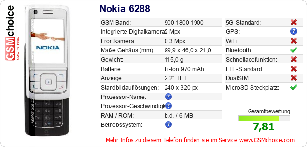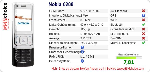 Hast du eigene Webseite? Willst du die Informationen über Standarddaten des Handys Nokia 6288 irgendwo veröffentlichen? Das ist sehr einfach. Du kannst das Bild herunterladen oder kopieren und auf der Webseite folgenden Code hinzufügen:Das Einfügen von diesem Code verursacht das Anzeigen von dem folgenden Bild: