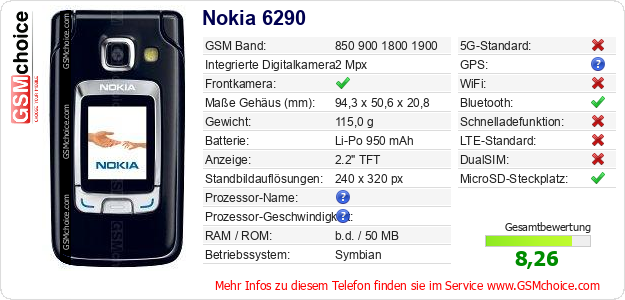 Hast du eigene Webseite? Willst du die Informationen über Standarddaten des Handys Nokia 6290 irgendwo veröffentlichen? Das ist sehr einfach. Du kannst das Bild herunterladen oder kopieren und auf der Webseite folgenden Code hinzufügen:Das Einfügen von diesem Code verursacht das Anzeigen von dem folgenden Bild: