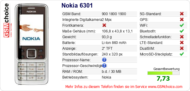 Hast du eigene Webseite? Willst du die Informationen über Standarddaten des Handys Nokia 6301 irgendwo veröffentlichen? Das ist sehr einfach. Du kannst das Bild herunterladen oder kopieren und auf der Webseite folgenden Code hinzufügen:Das Einfügen von diesem Code verursacht das Anzeigen von dem folgenden Bild: