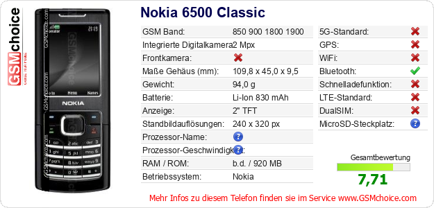 Hast du eigene Webseite? Willst du die Informationen über Standarddaten des Handys Nokia 6500 Classic irgendwo veröffentlichen? Das ist sehr einfach. Du kannst das Bild herunterladen oder kopieren und auf der Webseite folgenden Code hinzufügen:Das Einfügen von diesem Code verursacht das Anzeigen von dem folgenden Bild: