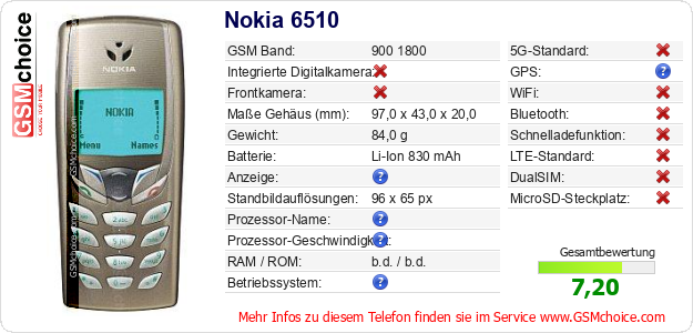 Hast du eigene Webseite? Willst du die Informationen über Standarddaten des Handys Nokia 6510 irgendwo veröffentlichen? Das ist sehr einfach. Du kannst das Bild herunterladen oder kopieren und auf der Webseite folgenden Code hinzufügen:Das Einfügen von diesem Code verursacht das Anzeigen von dem folgenden Bild: