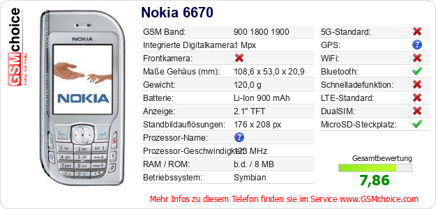Hast du eigene Webseite? Willst du die Informationen über Standarddaten des Handys Nokia 6670 irgendwo veröffentlichen? Das ist sehr einfach. Du kannst das Bild herunterladen oder kopieren und auf der Webseite folgenden Code hinzufügen:Das Einfügen von diesem Code verursacht das Anzeigen von dem folgenden Bild: