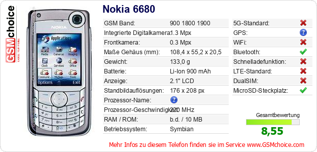 Hast du eigene Webseite? Willst du die Informationen über Standarddaten des Handys Nokia 6680 irgendwo veröffentlichen? Das ist sehr einfach. Du kannst das Bild herunterladen oder kopieren und auf der Webseite folgenden Code hinzufügen:Das Einfügen von diesem Code verursacht das Anzeigen von dem folgenden Bild: