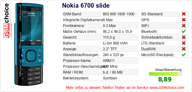 Hast du eigene Webseite? Willst du die Informationen über Standarddaten des Handys Nokia 6700 slide irgendwo veröffentlichen? Das ist sehr einfach. Du kannst das Bild herunterladen oder kopieren und auf der Webseite folgenden Code hinzufügen:Das Einfügen von diesem Code verursacht das Anzeigen von dem folgenden Bild: