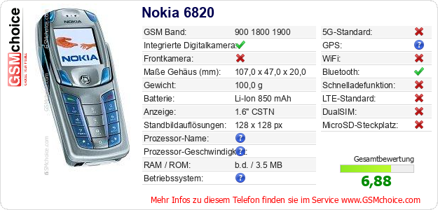 Hast du eigene Webseite? Willst du die Informationen über Standarddaten des Handys Nokia 6820 irgendwo veröffentlichen? Das ist sehr einfach. Du kannst das Bild herunterladen oder kopieren und auf der Webseite folgenden Code hinzufügen:Das Einfügen von diesem Code verursacht das Anzeigen von dem folgenden Bild:
