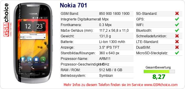 Hast du eigene Webseite? Willst du die Informationen über Standarddaten des Handys Nokia 701 irgendwo veröffentlichen? Das ist sehr einfach. Du kannst das Bild herunterladen oder kopieren und auf der Webseite folgenden Code hinzufügen:Das Einfügen von diesem Code verursacht das Anzeigen von dem folgenden Bild: