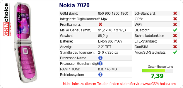 Hast du eigene Webseite? Willst du die Informationen über Standarddaten des Handys Nokia 7020 irgendwo veröffentlichen? Das ist sehr einfach. Du kannst das Bild herunterladen oder kopieren und auf der Webseite folgenden Code hinzufügen:Das Einfügen von diesem Code verursacht das Anzeigen von dem folgenden Bild: