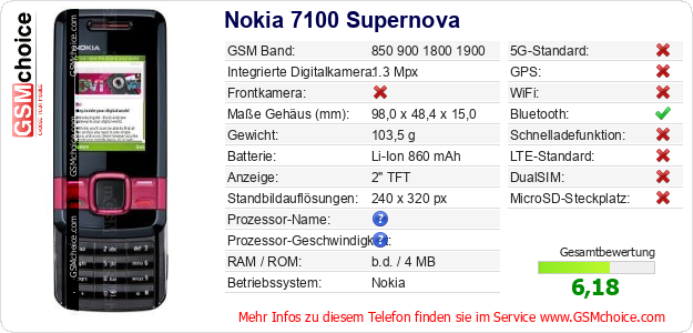 Hast du eigene Webseite? Willst du die Informationen über Standarddaten des Handys Nokia 7100 Supernova irgendwo veröffentlichen? Das ist sehr einfach. Du kannst das Bild herunterladen oder kopieren und auf der Webseite folgenden Code hinzufügen:Das Einfügen von diesem Code verursacht das Anzeigen von dem folgenden Bild: