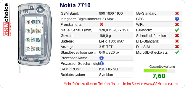 Hast du eigene Webseite? Willst du die Informationen über Standarddaten des Handys Nokia 7710 irgendwo veröffentlichen? Das ist sehr einfach. Du kannst das Bild herunterladen oder kopieren und auf der Webseite folgenden Code hinzufügen:Das Einfügen von diesem Code verursacht das Anzeigen von dem folgenden Bild: