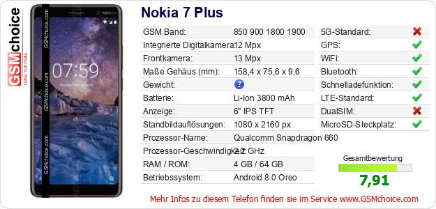 Hast du eigene Webseite? Willst du die Informationen über Standarddaten des Handys Nokia 7 Plus irgendwo veröffentlichen? Das ist sehr einfach. Du kannst das Bild herunterladen oder kopieren und auf der Webseite folgenden Code hinzufügen:Das Einfügen von diesem Code verursacht das Anzeigen von dem folgenden Bild: