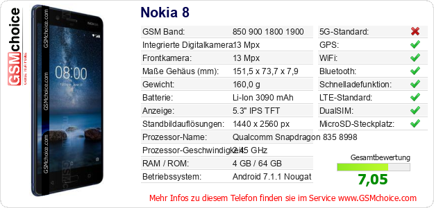 Hast du eigene Webseite? Willst du die Informationen über Standarddaten des Handys Nokia 8 irgendwo veröffentlichen? Das ist sehr einfach. Du kannst das Bild herunterladen oder kopieren und auf der Webseite folgenden Code hinzufügen:Das Einfügen von diesem Code verursacht das Anzeigen von dem folgenden Bild: