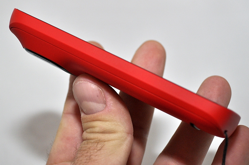 Nokia hat doch auf diese Platform verzichtet und sich für „Fenster” entschieden! Dieses Modell zeichnet sich auch durch das Gewicht aus, es wiegt fast 170 g. Obwohl 808 ziemlich schwer ist, liegt es perfekt in der Hand. Da das Gehäuse ganz dick ist, scheint das Gerät wirklich ordentlich gebaut zu sein. Die Rückseite wurde so geformt, dass das Handy perfekt in der Hand (eher in der männlichen Hand) liegt. Die Konstruktion ist ideal ausgewogen und die matte Oberflächenstruktur der Rückseite und der Seiten sorgt für einen sicheren Griff. Die nächsten Elemente, die mir sofort aufgefallen sind, sind die Seitentasten. Unter diesen gibt es etwas absolut Sensationelles – eine Schiebetaste zum Sperren des Geräts, die gleichzeitig ein Schalter der LED-Taschenlampe ist. Es gibt auch eine große Taste zum Aktivieren der Kamera und einen Lautstärkeregler.