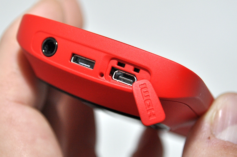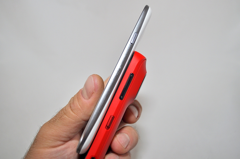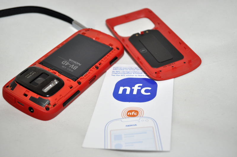 Ich muss auch ein paar Worte über Anschlüsse sagen. Zu der Ausstattung gehören: ein Micro-USB-Anschluss, Mini Jack Audio Anschluss, HDMI-Micro-Anschluss – nur dieser ist durch die Blende bedeckt. Der Vorderteil ist eine schwarze Fläche, unter dem Display befinden sich 3 Tasten. Alles wurde sehr ordentlich montiert, das Gehäuse knackt nicht und die Plastik-Qualität ist wirklich gut. Der zu dem Gerät beigelegte Satz enttäuscht auch nicht. Außer den typischen Elementen wie das USB-Kabel und Ladegerät finden wir drinnen ein tolles Headset mit der Silikon-Hülle und...ein Armband. Dazu kriegt man noch NFC Tags, die dem Nutzer den Einstieg in diese Technik erleichtern sollen. Dank der NFC-Technik können wir durch das Berühren des NFC-Bereichs verschiedene Funktionen des Smartphones aktivieren, Verbindung mit anderen NFC-kompatiblen Geräten herstellen und in der Zukunft hoffentlich auf diese Art und Weise in jedem Geschäft bezahlen. Die NFC-Antenne befindet sich unter dem Akku-Deckel, die Klappe ist auf der Innenseite mit kleinen Nasen ausgestattet, man muss den Deckel einfach abheben. Unter diesem gibt es auch einen 1400 mAh starken Akku und den Steckplatz für die microSD- und microSIM-Karte. Von dem Display bin ich ein bisschen enttäuscht. Es steht uns zwar das AMOLED-Display zur Verfügung, die Farbpalette ist auch in Ordnung...aber die Auflösung ist veraltet. Zum Trost bekommen wir den guten Lesewinkel und optimale Helligkeit. Das Display wurde mit dem widerstandsfähigen Stoff bedeckt. Was den Touchscreen betrifft, kann man ihm auch nichts vorwerfen.