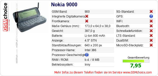 Hast du eigene Webseite? Willst du die Informationen über Standarddaten des Handys Nokia 9000 irgendwo veröffentlichen? Das ist sehr einfach. Du kannst das Bild herunterladen oder kopieren und auf der Webseite folgenden Code hinzufügen:Das Einfügen von diesem Code verursacht das Anzeigen von dem folgenden Bild: