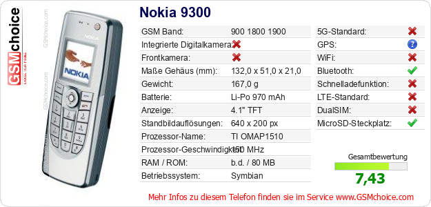 Hast du eigene Webseite? Willst du die Informationen über Standarddaten des Handys Nokia 9300 irgendwo veröffentlichen? Das ist sehr einfach. Du kannst das Bild herunterladen oder kopieren und auf der Webseite folgenden Code hinzufügen:Das Einfügen von diesem Code verursacht das Anzeigen von dem folgenden Bild: