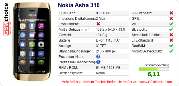 Hast du eigene Webseite? Willst du die Informationen über Standarddaten des Handys Nokia Asha 310 irgendwo veröffentlichen? Das ist sehr einfach. Du kannst das Bild herunterladen oder kopieren und auf der Webseite folgenden Code hinzufügen:Das Einfügen von diesem Code verursacht das Anzeigen von dem folgenden Bild:
