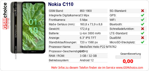 Hast du eigene Webseite? Willst du die Informationen über Standarddaten des Handys Nokia C110 irgendwo veröffentlichen? Das ist sehr einfach. Du kannst das Bild herunterladen oder kopieren und auf der Webseite folgenden Code hinzufügen:Das Einfügen von diesem Code verursacht das Anzeigen von dem folgenden Bild: