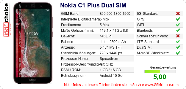 Hast du eigene Webseite? Willst du die Informationen über Standarddaten des Handys Nokia C1 Plus Dual SIM irgendwo veröffentlichen? Das ist sehr einfach. Du kannst das Bild herunterladen oder kopieren und auf der Webseite folgenden Code hinzufügen:Das Einfügen von diesem Code verursacht das Anzeigen von dem folgenden Bild: