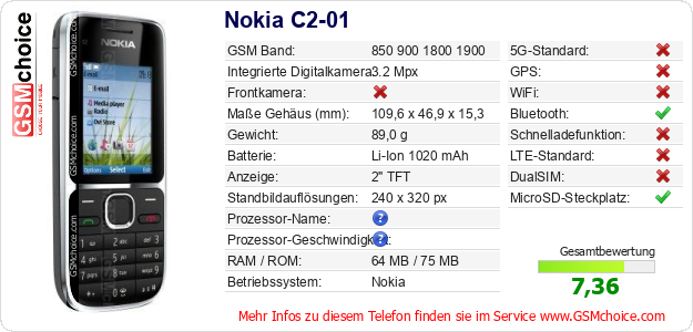 Hast du eigene Webseite? Willst du die Informationen über Standarddaten des Handys Nokia C2-01 irgendwo veröffentlichen? Das ist sehr einfach. Du kannst das Bild herunterladen oder kopieren und auf der Webseite folgenden Code hinzufügen:Das Einfügen von diesem Code verursacht das Anzeigen von dem folgenden Bild:
