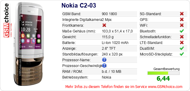 Hast du eigene Webseite? Willst du die Informationen über Standarddaten des Handys Nokia C2-03 irgendwo veröffentlichen? Das ist sehr einfach. Du kannst das Bild herunterladen oder kopieren und auf der Webseite folgenden Code hinzufügen:Das Einfügen von diesem Code verursacht das Anzeigen von dem folgenden Bild: