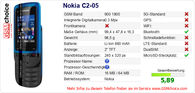 Hast du eigene Webseite? Willst du die Informationen über Standarddaten des Handys Nokia C2-05 irgendwo veröffentlichen? Das ist sehr einfach. Du kannst das Bild herunterladen oder kopieren und auf der Webseite folgenden Code hinzufügen:Das Einfügen von diesem Code verursacht das Anzeigen von dem folgenden Bild: