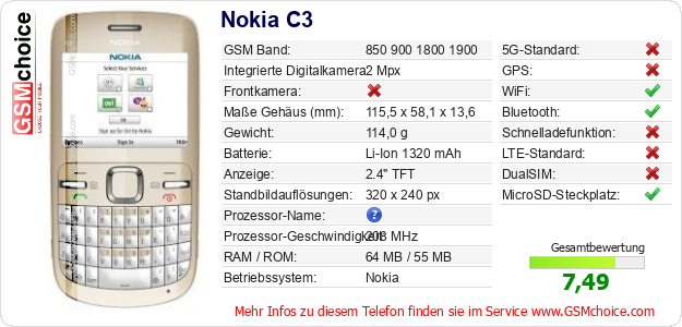 Hast du eigene Webseite? Willst du die Informationen über Standarddaten des Handys Nokia C3 irgendwo veröffentlichen? Das ist sehr einfach. Du kannst das Bild herunterladen oder kopieren und auf der Webseite folgenden Code hinzufügen:Das Einfügen von diesem Code verursacht das Anzeigen von dem folgenden Bild:
