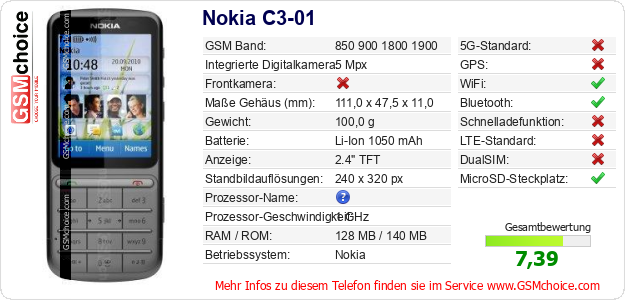 Hast du eigene Webseite? Willst du die Informationen über Standarddaten des Handys Nokia C3-01 irgendwo veröffentlichen? Das ist sehr einfach. Du kannst das Bild herunterladen oder kopieren und auf der Webseite folgenden Code hinzufügen:Das Einfügen von diesem Code verursacht das Anzeigen von dem folgenden Bild: