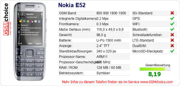 Hast du eigene Webseite? Willst du die Informationen über Standarddaten des Handys Nokia E52 irgendwo veröffentlichen? Das ist sehr einfach. Du kannst das Bild herunterladen oder kopieren und auf der Webseite folgenden Code hinzufügen:Das Einfügen von diesem Code verursacht das Anzeigen von dem folgenden Bild: