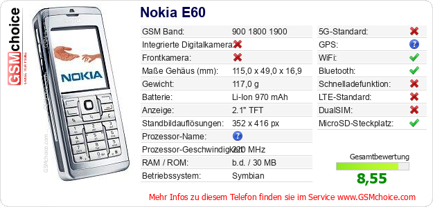 Hast du eigene Webseite? Willst du die Informationen über Standarddaten des Handys Nokia E60 irgendwo veröffentlichen? Das ist sehr einfach. Du kannst das Bild herunterladen oder kopieren und auf der Webseite folgenden Code hinzufügen:Das Einfügen von diesem Code verursacht das Anzeigen von dem folgenden Bild: