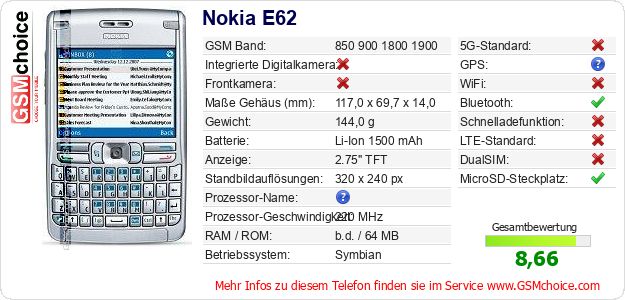 Hast du eigene Webseite? Willst du die Informationen über Standarddaten des Handys Nokia E62 irgendwo veröffentlichen? Das ist sehr einfach. Du kannst das Bild herunterladen oder kopieren und auf der Webseite folgenden Code hinzufügen:Das Einfügen von diesem Code verursacht das Anzeigen von dem folgenden Bild: