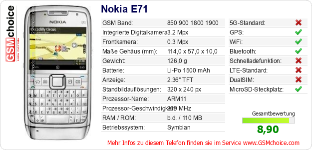Hast du eigene Webseite? Willst du die Informationen über Standarddaten des Handys Nokia E71 irgendwo veröffentlichen? Das ist sehr einfach. Du kannst das Bild herunterladen oder kopieren und auf der Webseite folgenden Code hinzufügen:Das Einfügen von diesem Code verursacht das Anzeigen von dem folgenden Bild: