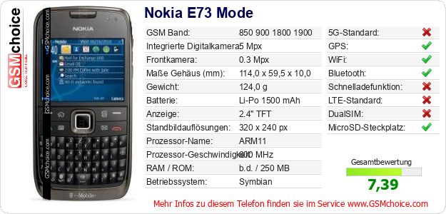 Hast du eigene Webseite? Willst du die Informationen über Standarddaten des Handys Nokia E73 Mode irgendwo veröffentlichen? Das ist sehr einfach. Du kannst das Bild herunterladen oder kopieren und auf der Webseite folgenden Code hinzufügen:Das Einfügen von diesem Code verursacht das Anzeigen von dem folgenden Bild: