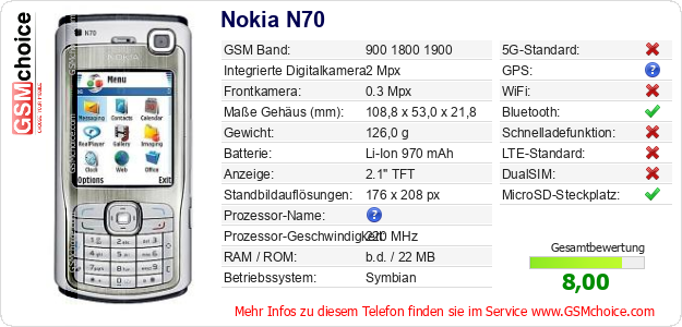 Hast du eigene Webseite? Willst du die Informationen über Standarddaten des Handys Nokia N70 irgendwo veröffentlichen? Das ist sehr einfach. Du kannst das Bild herunterladen oder kopieren und auf der Webseite folgenden Code hinzufügen:Das Einfügen von diesem Code verursacht das Anzeigen von dem folgenden Bild: